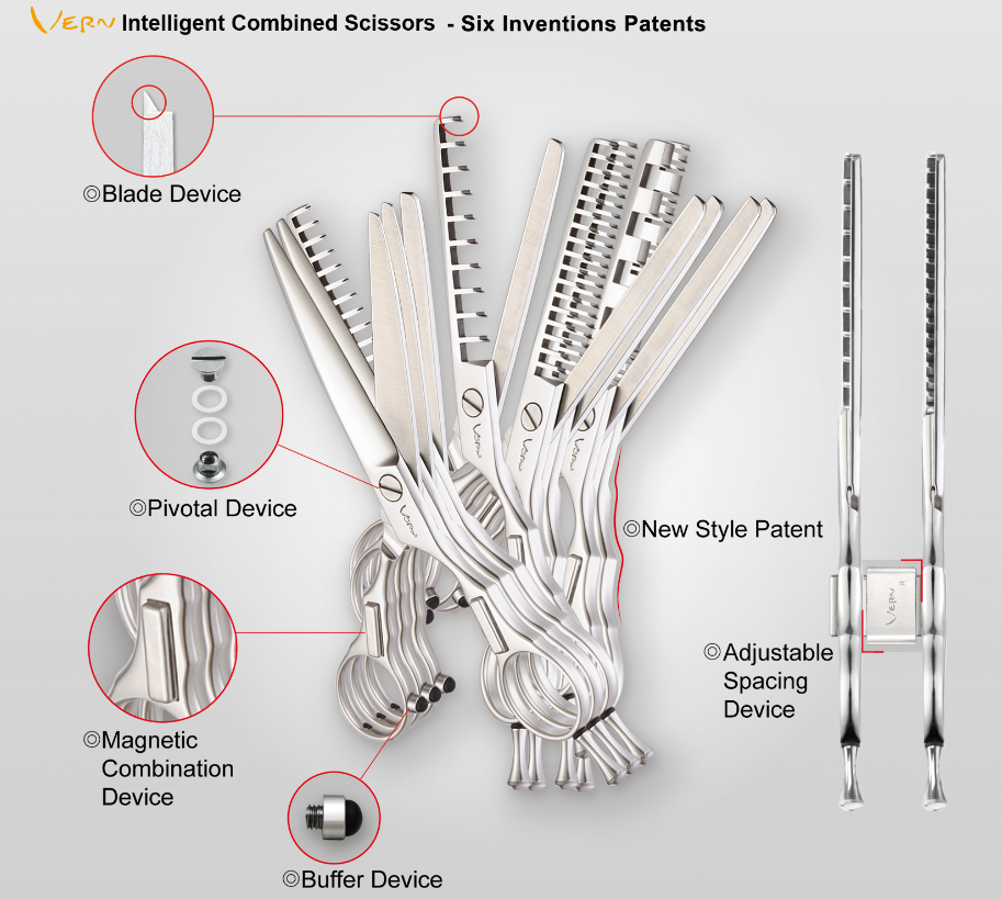 Vern je imetnik treh patentov, in sicer za kombinacijo, za zobce oblike L in za nov dizajn škarij. Vernovi patenti zagotavljajo, da se naše škarje bistveno razlikujejo od ostalih škarij na trgu ter jih postavljajo 20 let pred konkurenco.